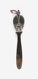 Stylised tortoise on two bird heads. The incised patterns heightened with lime. The tortoise wears a necklace of trading beads in the colour red, blue and white.