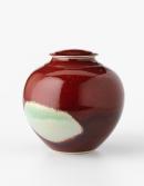 Globular jar with flat base and slight domed, wide lid; with 'sang-de-boeuf' glaze.