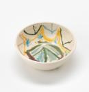Shallow bowl with white ground and polychrome decoratino on the interior of abstracted sail motifs.