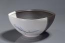 Deep squared bowl with wide mouth, one side with black stain, the other with white glaze decorated with pale blue and gold brushwork.