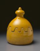 Lidded jar with yellow glaze, dome shaped surmounted by a shaped knop, the lid and base meeting in the centre in nine irregular interlocking protrusions.