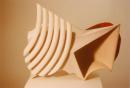 Abstract form with textured surfaces, curved and angled, with an irregular shaped opening at the front coming to a point at the top corner; six curved solid cylindrical forms also at the front in white; one end opening forming an inverted 'D'; the other a curved irregular 'wing' with red glaze on the insider, white on the outside; elsewhere unglaze grey, white and light green with the inside creamy pink.