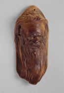 Shaped double-sided plaque drilled with hole at top for suspension. Modelled on the obverse with the head of an elderly, bearded male Aborigine, and in the concave reverse with the heads, one above the other, of two Aboriginal children. Dark umber glaze on heads.
