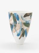 Tall vase with wide mouth and curving to a narrow foot. Slip-cast bone chine, decorated with loose brush-strokes in colours, blue predmoninating.