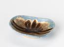 Asymmetrical dish with two brown wavy lines with five brown finger-like projections rising frmo the centre of the top line.