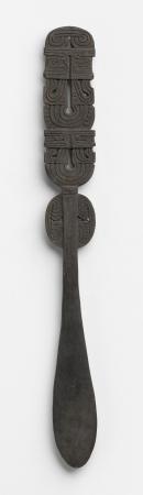 Two addorsed human figures squatting on top of another two squatting human figures with two stylised birds on top. Incised double scrolls and lines and carved keyholes.