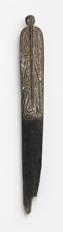 Deep complex scrollwork with central double ridge and knob on the handle. Incised surface patterns heightened with lime.