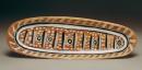 Narrow oblong dish decorated in black, white and tan with dashes, circles and dots, the reverse with goanna and snake motifs in pale grey on cream body.