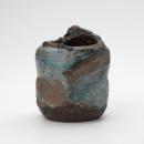 Vase of irregular waisted shape with an uneven rim, the dull black surface with blue glaze.