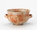 Large bowl, swelling from a small foot towards an irregular rim, a ridge running parallel beneath, and supplied with two strap handles with thumbed down terminations, the whole with uneven orange and grey (shino) glaze.