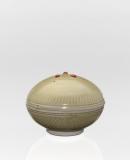 Lidded box of depressed spherical form with impressed decoration under a pale olive glaze and three raised spots on the lid in red.