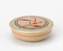 Low circular lidded box decorated with red and green leaf motif between circles of red and green on a pale grey crackled ground.