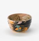 Bowl with moulded concentric circles with an underglaze figurative decoration, in black, orange, pink, turquoise, blue and white glazes.