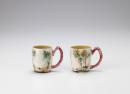 Two barrel-shaped mugs with high-arching handles, the underglaze polychrome decoration showing kangaroos in a bush landscape, the interiors glazed in yellow, the handles in deep pink.