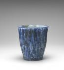 Upright vessel of flaring form decorated with closely ranged vertical incision lines under a blue glaze streaked with blue-black and white.
