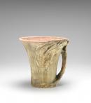 Upright vessel of strongly flaring form with handle modelled in the shape of a branch, the foliage continuing in relief on the body, the buff clay with areas of black oxide complementing the modelling, the interior stained pink.