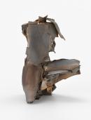 Human figure consisting of a torso supported on one leg truncated at the knee, the left thigh projecting horizontally, the form built up from sheets of clay, coloured with grey, pink and silver lustre glazes.