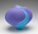 Rounded form comprising three spiralling lobes set on a narrow foot and decorated with light blue and purple dry glazes.