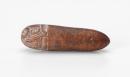 An oblong shaped lime gourd container with a circular opening at one end. Incised patterns around and near the opening all heightened with lime.