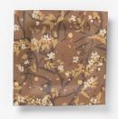 Square platter with concave centre and broad flat rim, the body of deep tan clay, its upper surface with all-over inlaid decoration of flowering branches in pink, white, greenish yellow and dark brown on a brown ground.