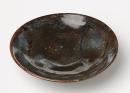 Shallow bowl decorated in blue and brown with a design suggesting blossoms and spikey leaves utilising a chün type glaze and wax resistant technique.