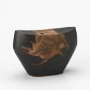 Vessel of elipitical section narrowing towards the base and supplied with a small opening in the concave upper surface, decorated with matt brownish black glaze and wish an applied design of ridged and coiled brown clay reaching from side to side across the top.