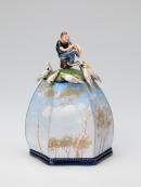 Hexagonal form tapering towards the top which has a finial in the form of a seated man with a hat, the firgure (which turns) is surrounded by seven modelled cockatoos attached to the body. The piece is supplied with a spherical bead pull to operate the musical mechanism. Figures are decorated in colours, three facets of the box bear a naturalistic landscape of gums and clouds, the remaining three are decorated with an abstract design in pink and shades of grey.