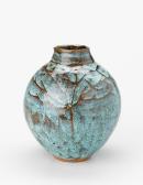 Globular jar with short tapering neck decorated in mottled blue with brown branching forms in wax resist technique.