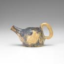 Teapot with substantial spout integrated with the body and massive rustic handle, the body modelled with a
