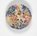 Round dish decorated in polychrome with heads of a donkey, a goat and a cock amid foliage.
