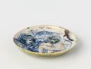 Circular platter painted in blue with a naked bearded figure and an angel, the design touched with colours, with a pale yellow rim and green reverse.