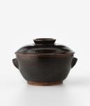 Bowl with gently flaring walls and two semi-circular lugs, and domed lid with circular (thrown) handgrip, the exterior surfaces with brown (tenmoku) glaze, the interior greyish-cream.