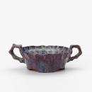 Hand-built shallow bowl with pinched edges and two irregular handles rising from the rim, decorated in blue and purple streaky glazes, the latter colour predominant on the exterior.