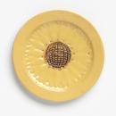 Circular plate with stylized sunflower in relief, yellow and brown glazes.