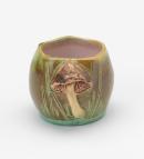 Squat form with pentagonal opening, modelled with a toadstood in relief coloured brown and pink on a variegated olive and turquoise ground, the interior glazed in pink.