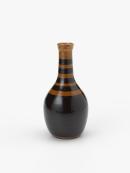 Tall-necked bottle with slightly everted rim, glazed in brown with yellow bands on neck and upper body.