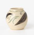 Globular form glazed over the cream body and decorated with abstract motifs in brown and green including large diagonal leaf-like forms and dot-circles.