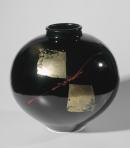 Spherical pot with upright rim, the white body covered in blaze glaze and decorated on front and back with a motif consisting of two rhomboidal areas of gold leaf set diagonally with a red splash interposed.