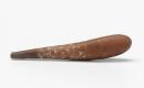 Large tubular shaped lime container with an opening at one end. On the middle of the gourd are carved and incised patterns of double scrolls, dots, wavy, circles and zig zags all heightened with lime.