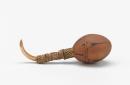 Oval shaped container with lid made from woven orchid fibre, cane and pigtusk. Burnt concentric half circle patterns.