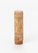 Decorated with incised wavey patterns and faces. One hole at the top of the container. Still some remains of lime inside the container.