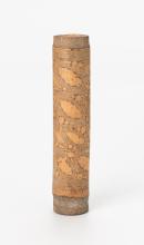 Lime container with stopper. Carved with circles and geometric patterns and oval shapes.