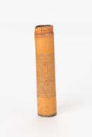 A hollow container open at one side. Geometric designs and patterns carved on the middle of the container, still some lime left inside.