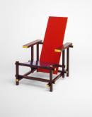 Deeply influenced by the painter Piet Mondrian and the rectilinear furniture designs of architect Frank Lloyd Wright, Gerrit Rietveld aimed to express a pure, ascetic functionalism in his furniture designs. This chair was first produced in stained wood but Rietveld subsequently painted it red, blue and yellow. During the 1920s the chair came to be identified with the influential Dutch design movement De Stijl, now regarded as one of the first major modern design movements. Purged of all ornament and stripped back to its barest structure, Rietveld’s Red-blue chair is a play on verticals and horizontals, an abstract, architectural construction that has since become an icon of early twentieth-century modernism.