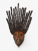 Stylised woven mask, oval shaped. Hair pieces are made of woven ringlets. Red, yellow/white on dark brown, bearded.