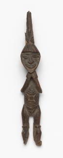 Carving of a zoomorphic with a pointed elongated nose or beak and carved out chest on top of a carved human figure. Human figure has carved cresentic section mouth and elliptic eyes, carved bands of Chevron patterns on body. Solid band carved on leg.