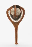 Brown, black, white mask, woven with a bird beak, possibly a parrot with a knob on the top of it.