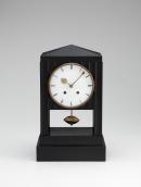 ebonised wood, glass, brass, clock mechanism, enamel, steel
