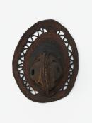 Woven stylised mask, pierced eyes in woven circular movement with a ridge set on a mount surrounded with an oval shaped body. Traces of pigment.