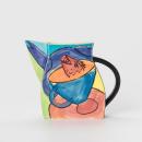 Jug with tilted vase-like silhouette and rectangular section, the arc-shaped handle and adjacent side painted black, the body and prominent spout with underglaze painting in bright colours depicting a small fish leaping from a teacup, and a teapot.